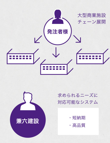 多くの人を集める大型商業施設から街にたたずむ小さなお店まで、ご要望に沿った建築物を数多く手掛けています。中でも近年は大型店建設のご縁が増えてきています。