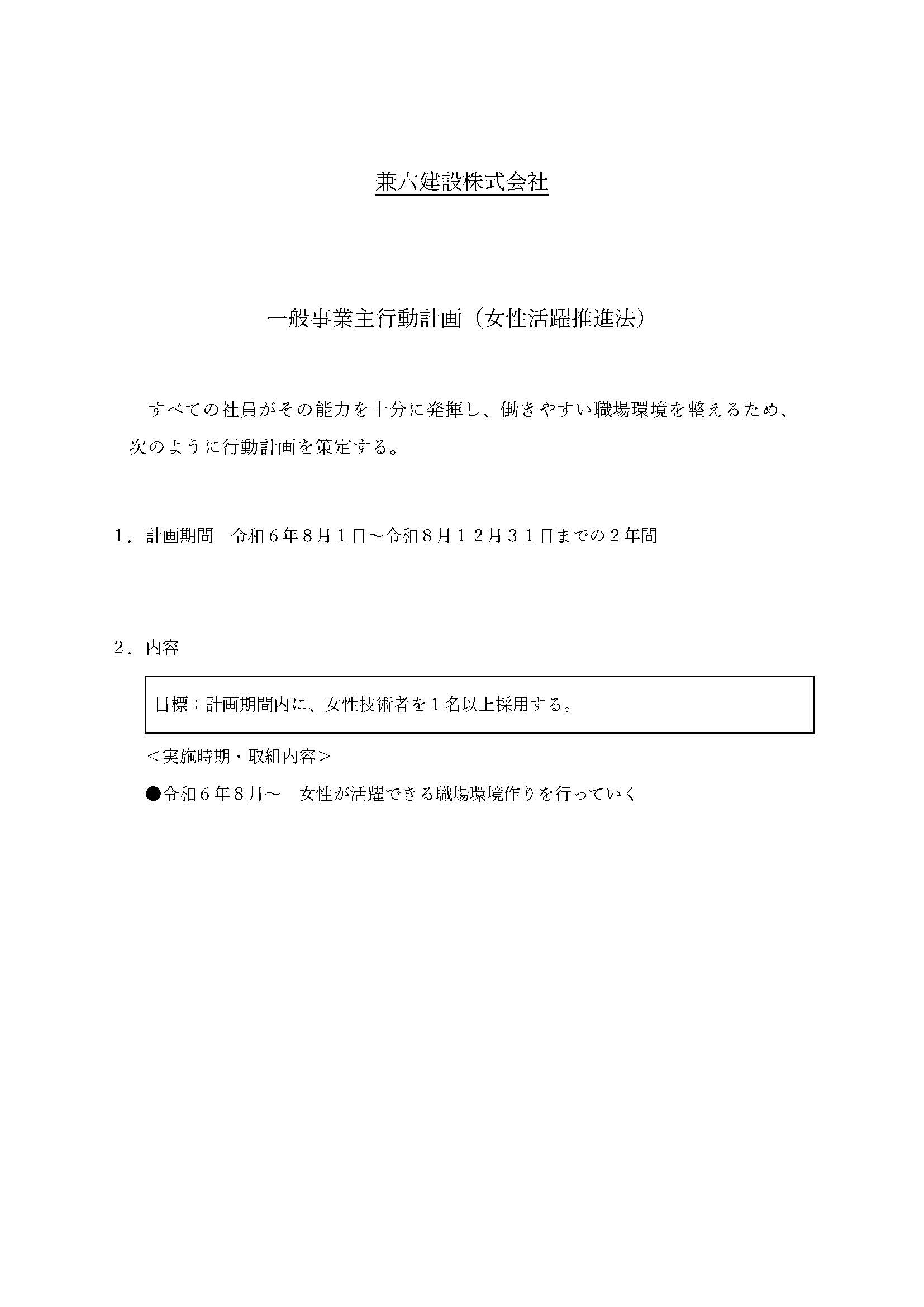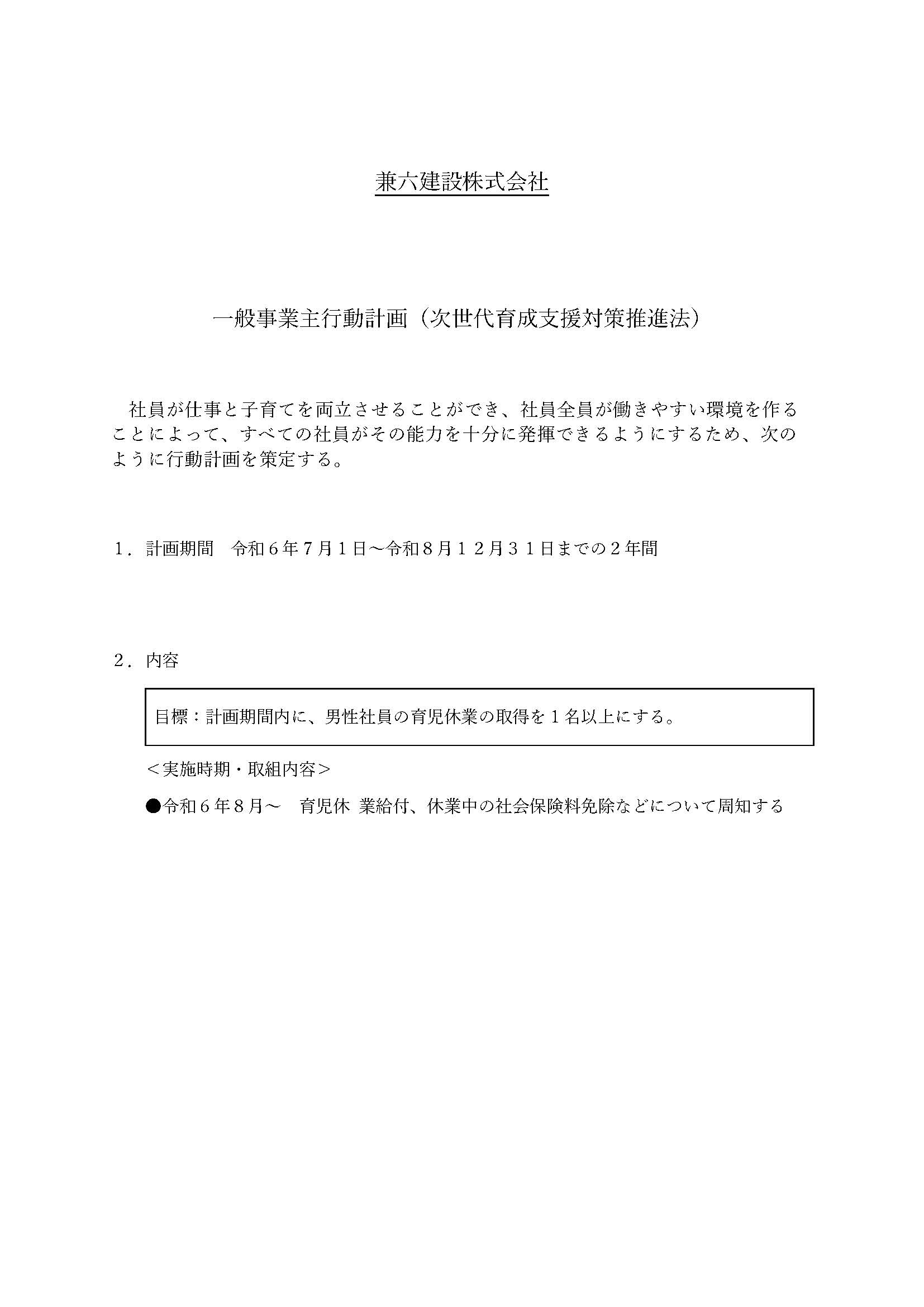 一般事業主行動計画について下記の通り策定し、行動計画達成に向けて実施します。